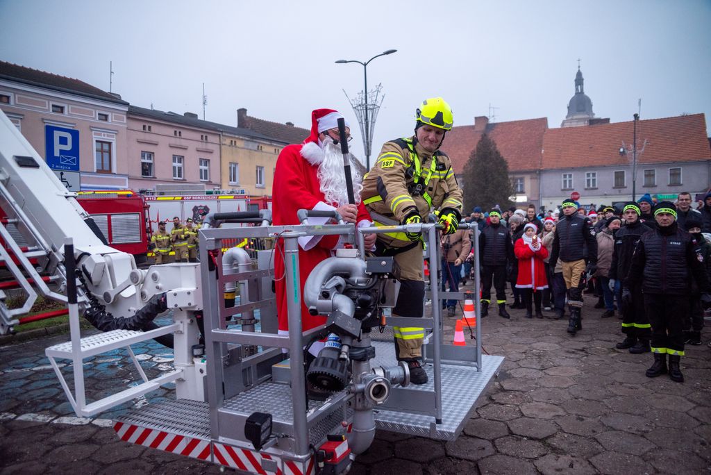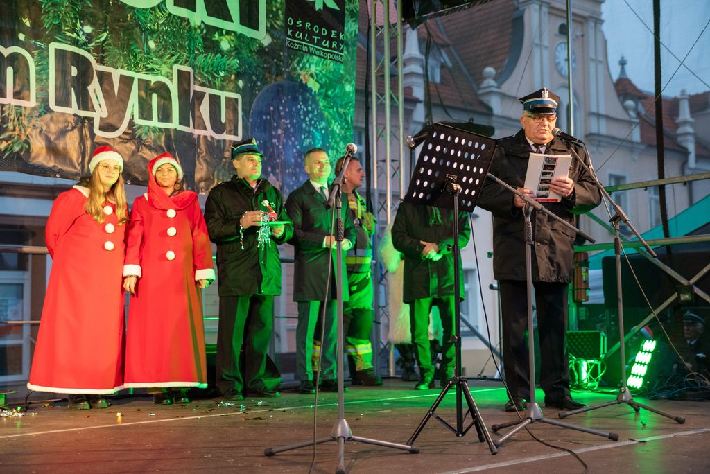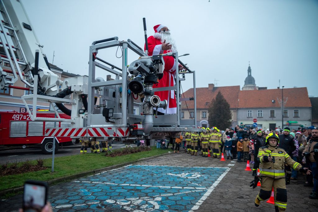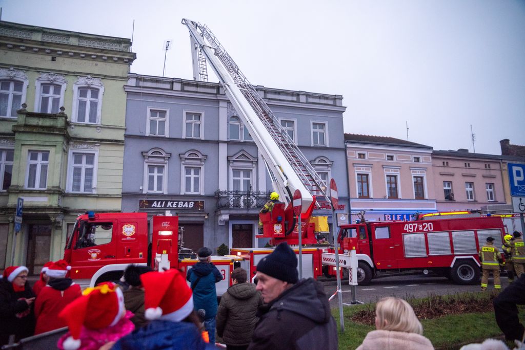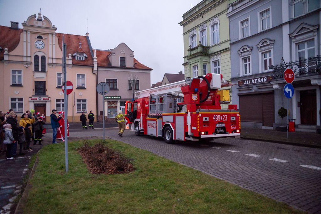 Zanim rozbłysła miejska choinka, strażacy z Ochotniczej Straży Pożarnej w Koźminie Wielkopolskim przeprowadzili widowiskową akcję ewakuacji Mikołaja z dachu. Operacja przebiegła sprawnie dzięki nowemu samochodowi z potężnym podnośnikiem, który niedawno zasilił wyposażenie jednostki. Niesforny święty szczęśliwie dotarł na ziemię, witany brawami i uśmiechami koźminian i koźminianek.