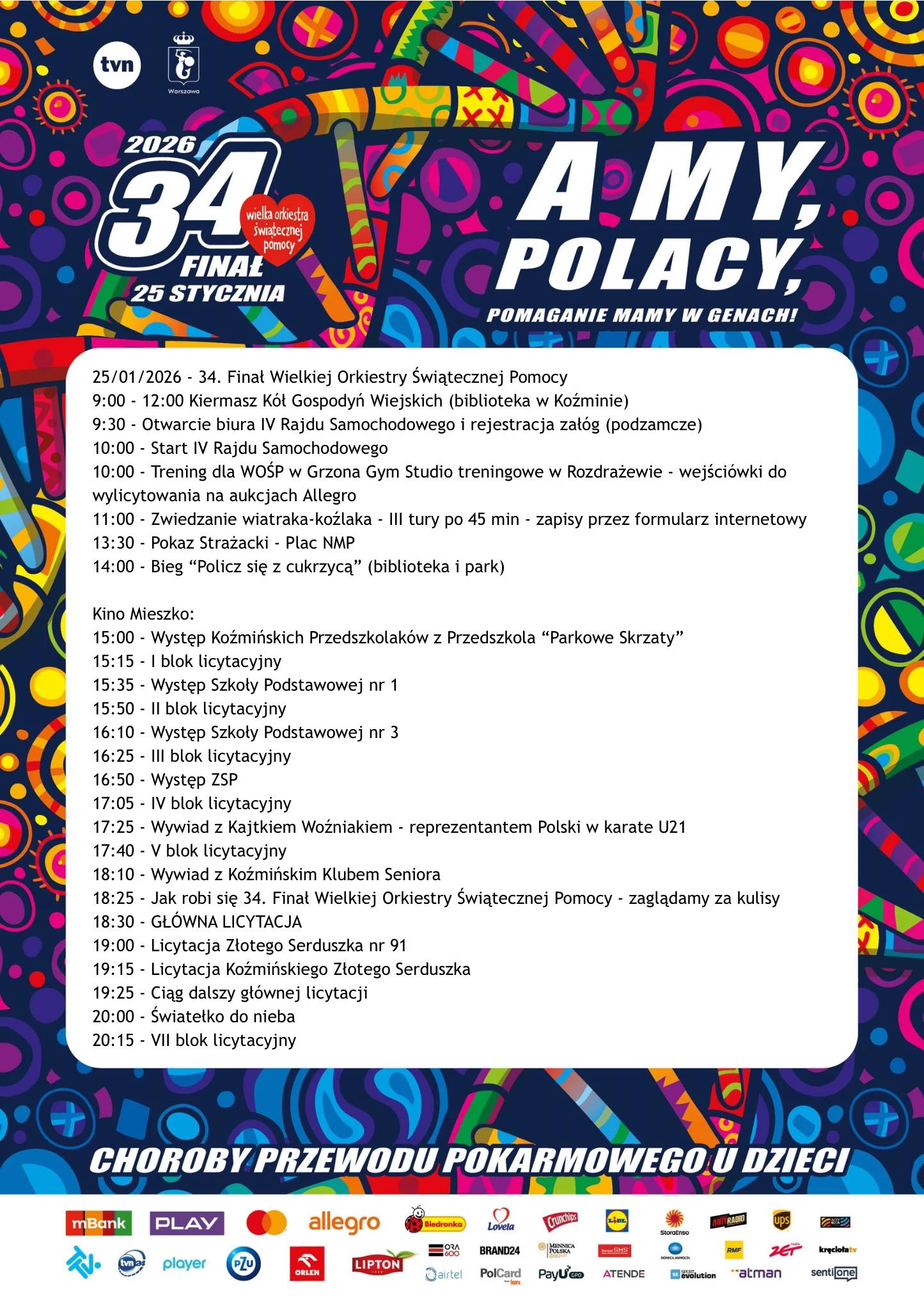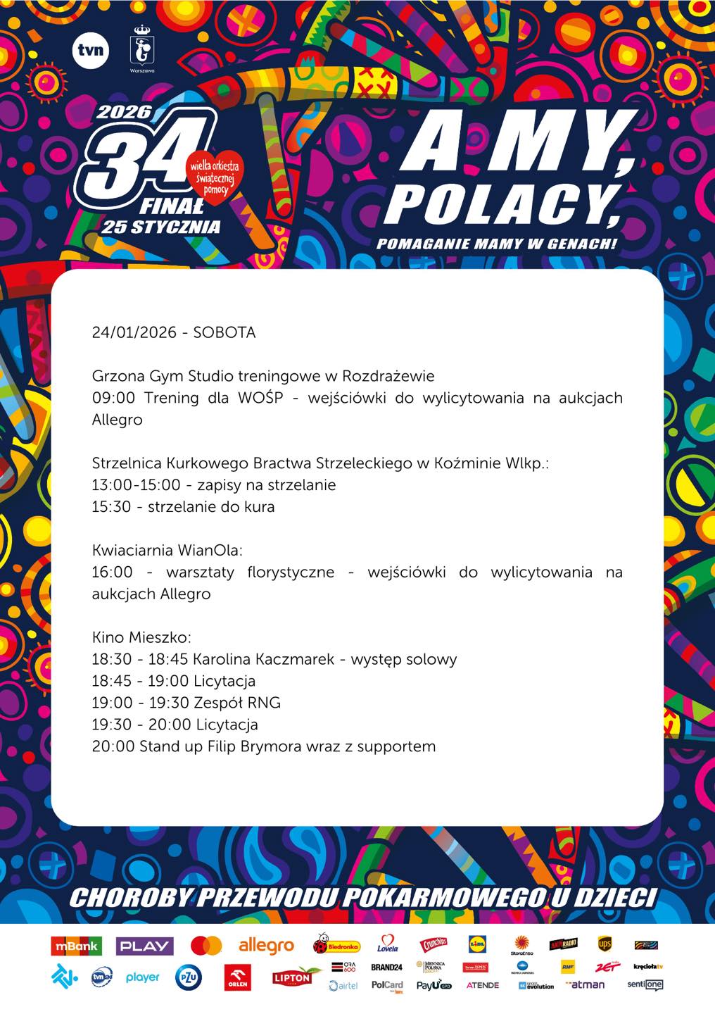 W dniach 24–25 stycznia 2026 r. w Koźminie Wielkopolskim odbędą się wydarzenia w ramach 34. Finału Wielkiej Orkiestry Świątecznej Pomocy, którego celem jest wsparcie leczenia chorób przewodu pokarmowego u dzieci.
