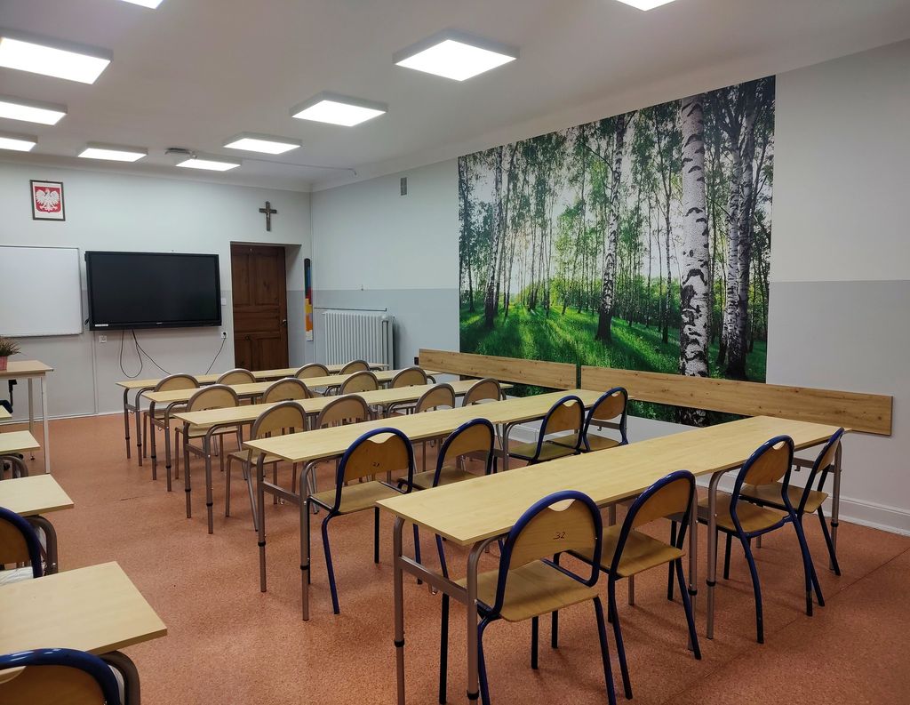 - kompletne wyposażenie sali: krzesła, stoły, biurko, szafy,
