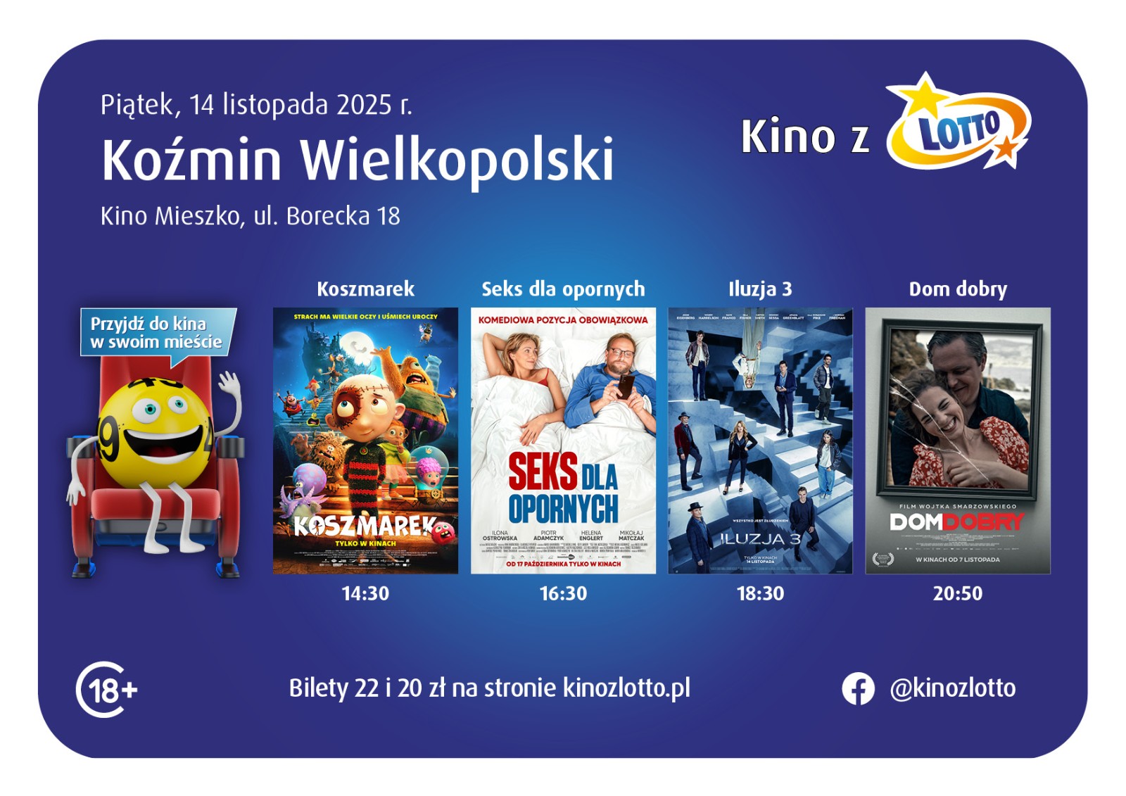 W piątek, 14 listopada 2025 roku w Kinie ,,Mieszko'' przy ul. Boreckiej 18 zapraszamy na seanse w ramach cyklu Kino z Lotto.