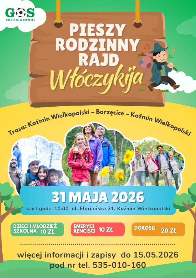 Gminny Ośrodek Sportu w Koźmin Wielkopolski zaprasza mieszkańców na Pieszy Rodzinny Rajd Włóczykija, który odbędzie się 31 maja 2026 roku. Zapisy na wydarzenie prowadzone są do 15 maja.
