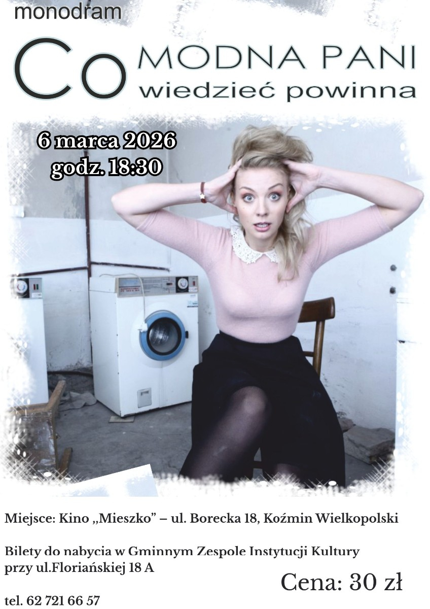 6 marca 2026 r. o godz. 18:30 w Kinie „Mieszko” w Koźminie Wielkopolskim odbędzie się monodram „Co modna Pani wiedzieć powinna”.