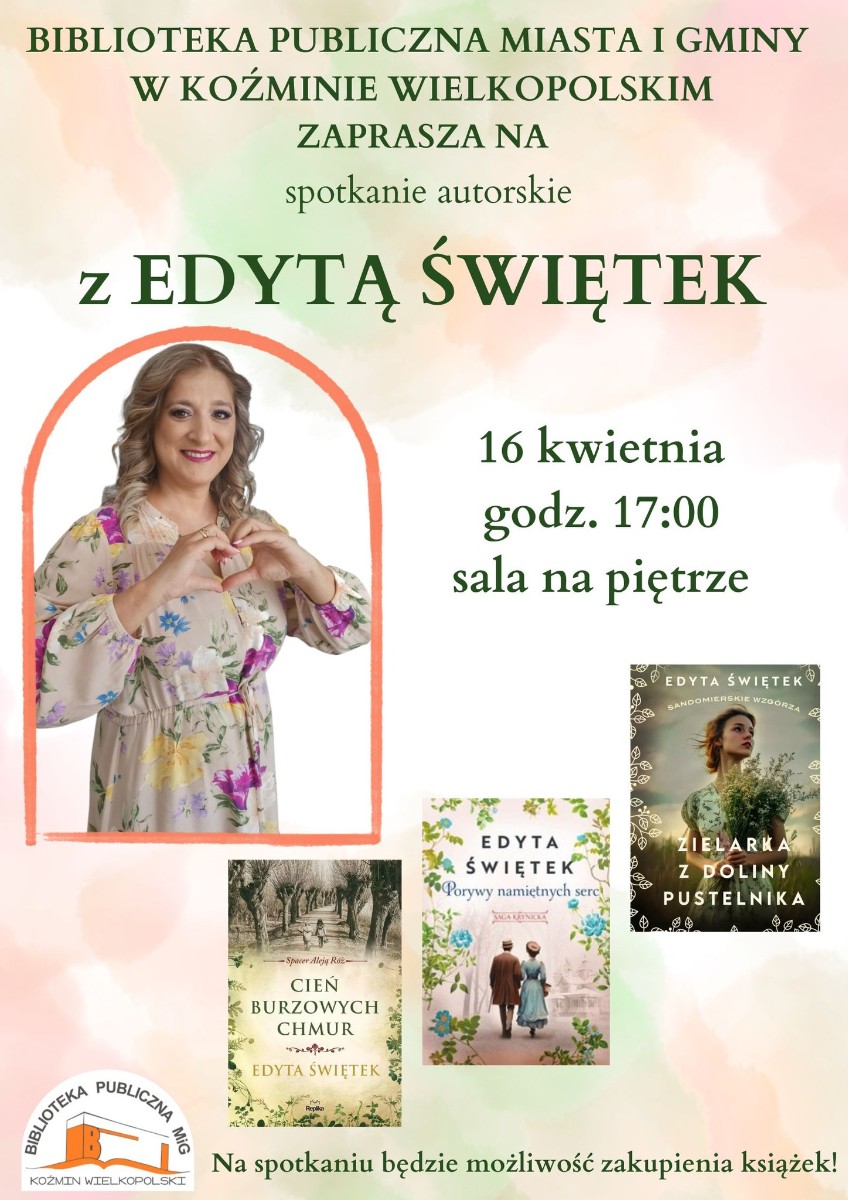 BIBLIOTEKA PUBLICZNA MIASTA I GMINY W KOŹMINIE WIELKOPOLSKIM ZAPRASZA NA SPOTKANIE AUTORSKIE Z EDYTĄ ŚWIĘTEK