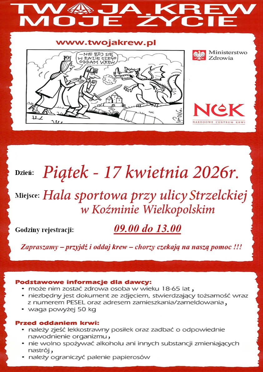 Dnia 17 kwietnia 2026 r. (piątek) w hali sportowej przy ulicy Strzeleckiej w Koźminie Wielkopolskim odbędzie się akcja honorowego krwiodawstwa . Rejestracja odbywa się w godzinach od 09:00 do 13:00.